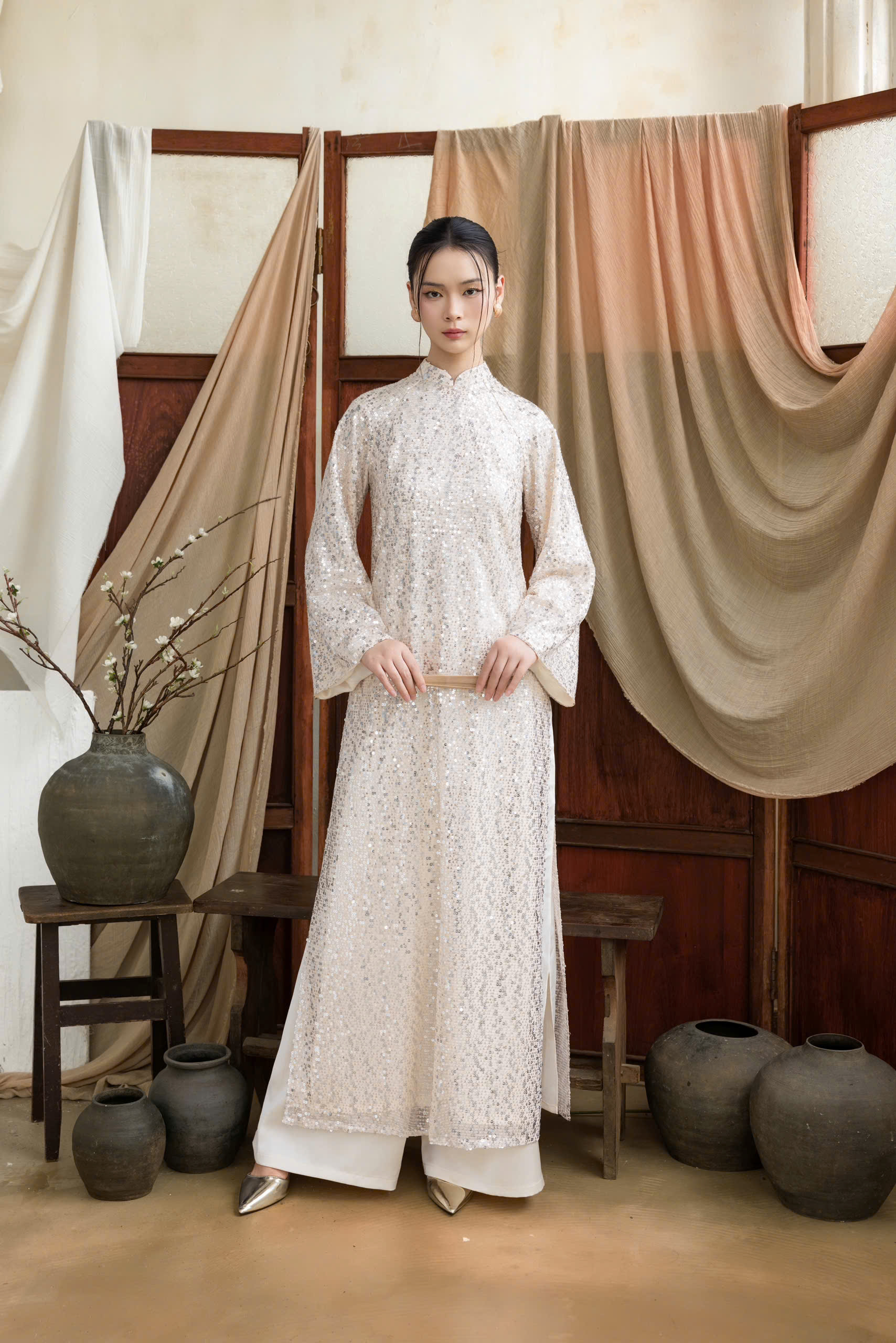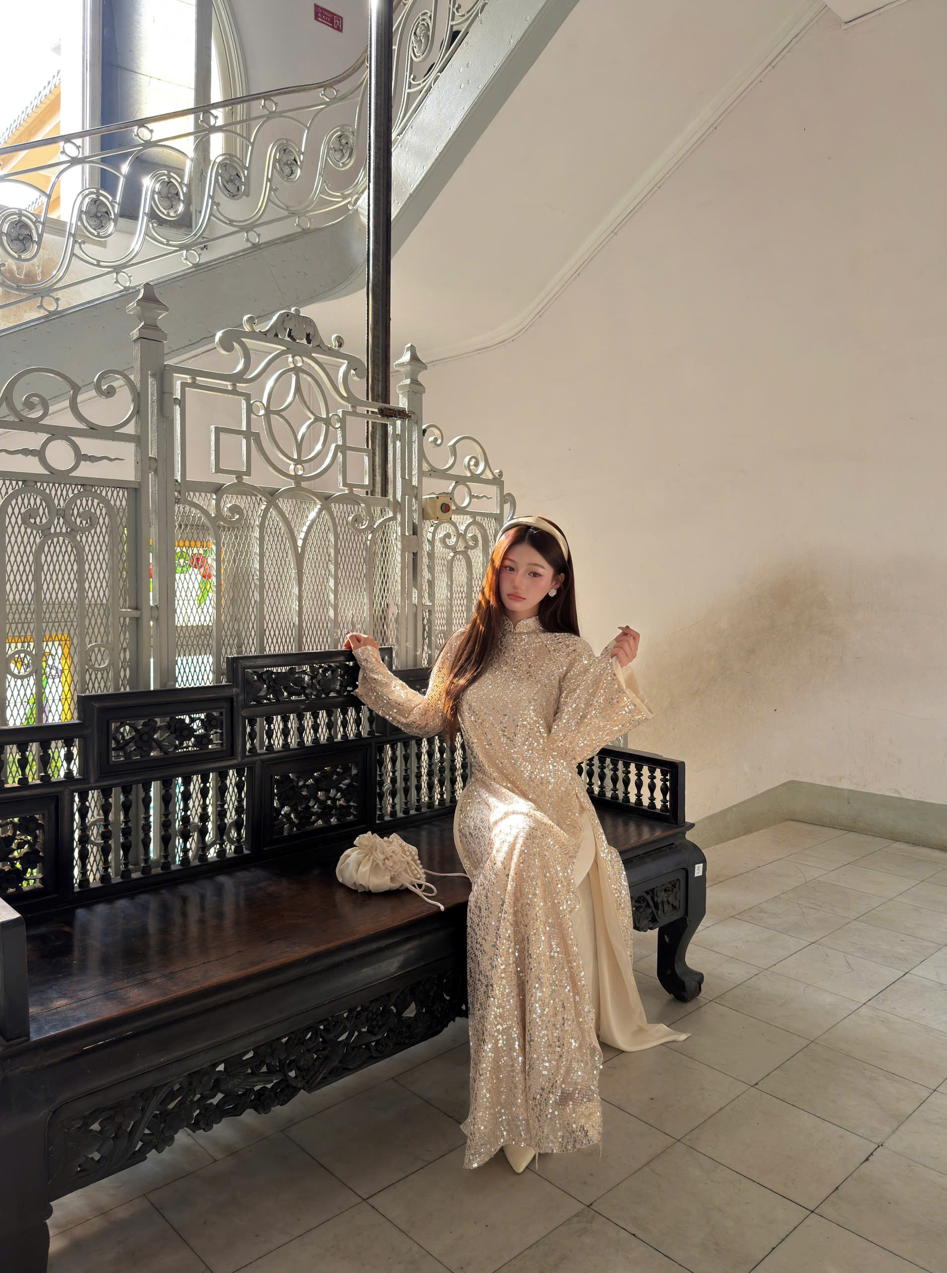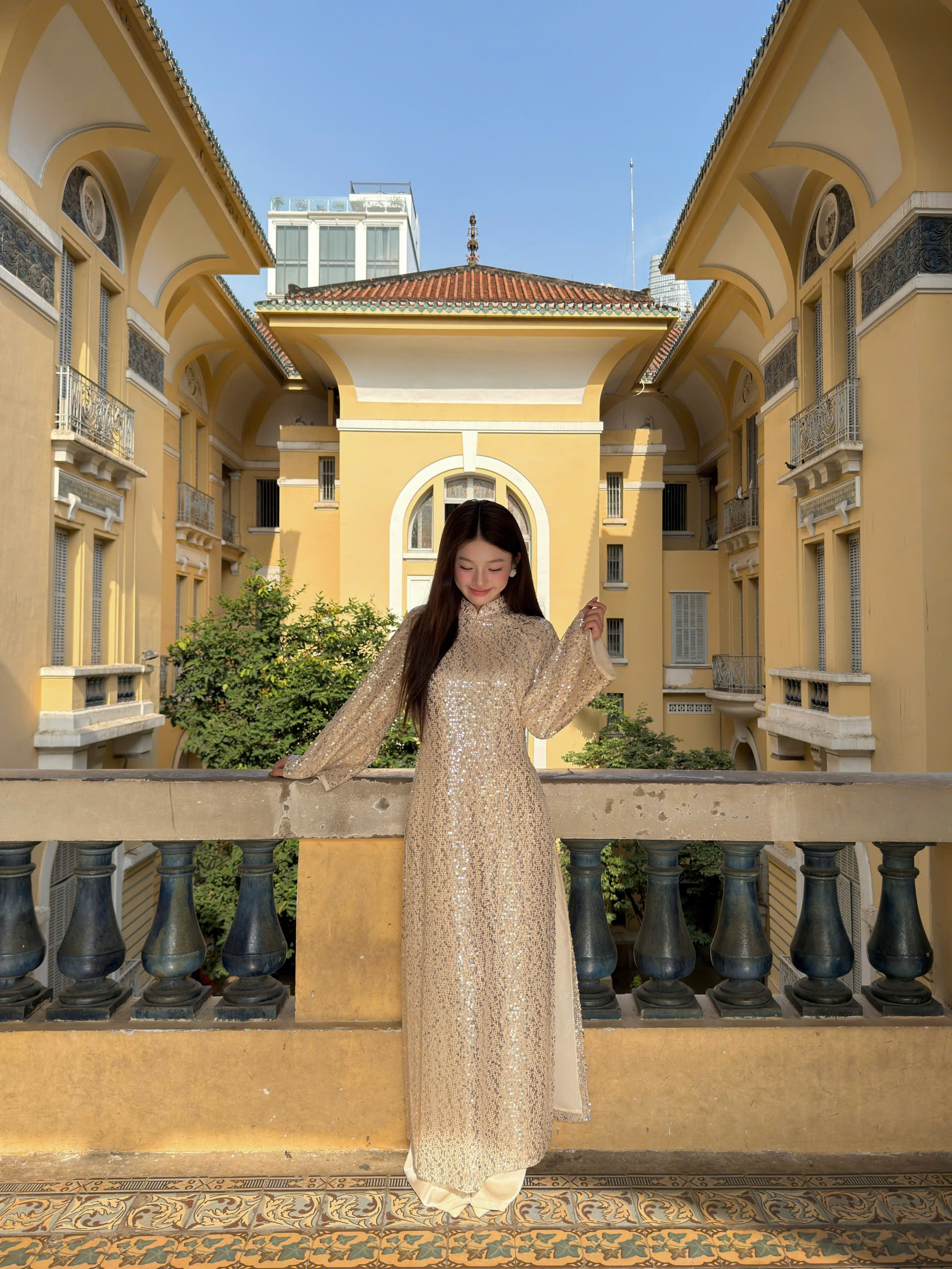 Đón Tết với tà áo dài lấp lánh đang "chiếm sóng" mọi phong cách! Chiếc áo dài này là sự kết hợp hoàn hảo giữa nét duyên dáng truyền thống và cảm hứng High-Fashion hiện đại. Chất liệu kim sa ánh vàng tinh tế giúp bạn "tỏa sáng" rực rỡ và "chốt deal" những bức ảnh "viral" nhất. Không cần cầu kỳ, chỉ cần item này là đủ để bạn "nâng cấp" vẻ ngoài chuẩn nàng thơ trong mọi dịp đặc biệt. Diện ngay và "Glow Up" thôi!