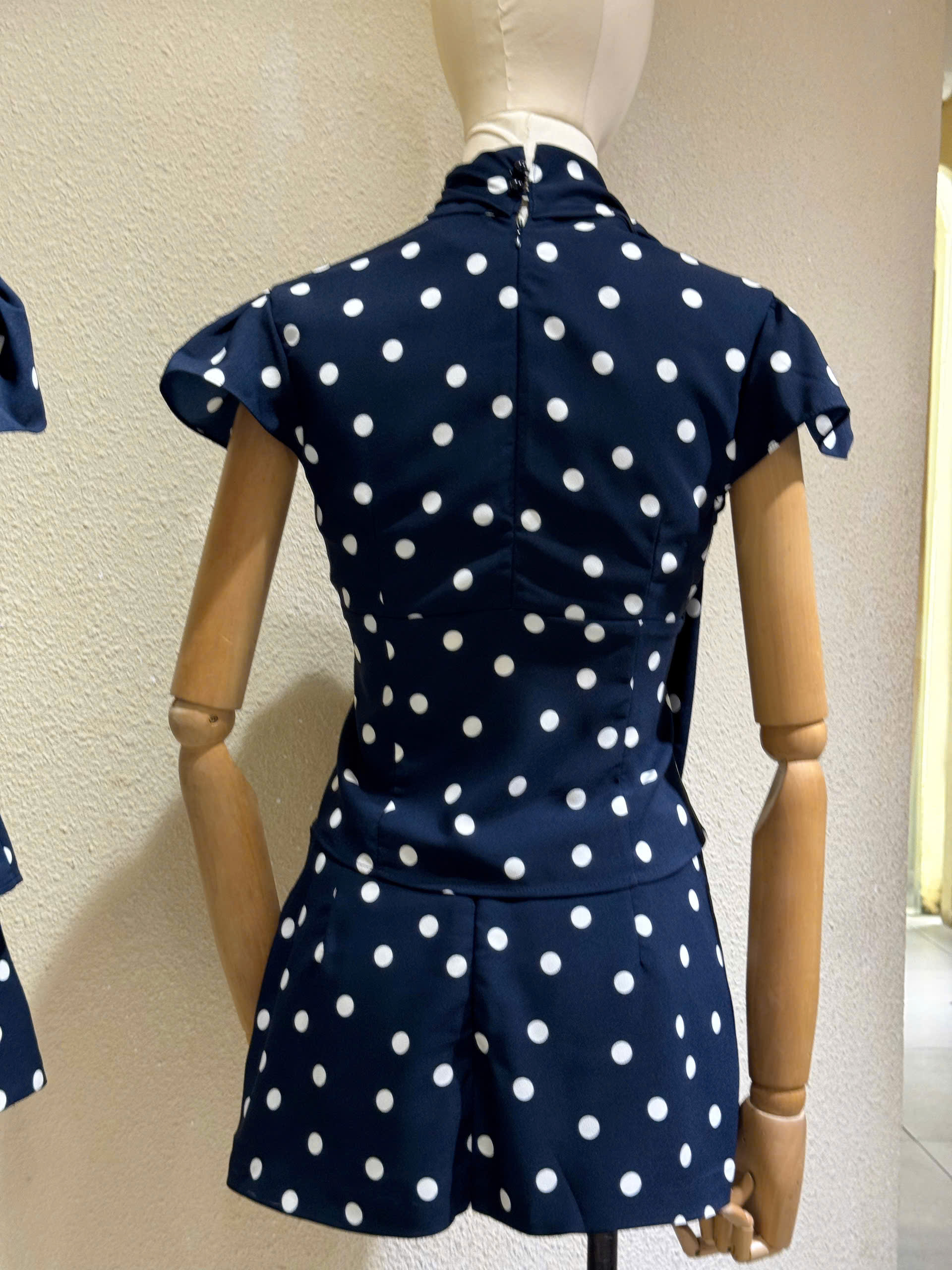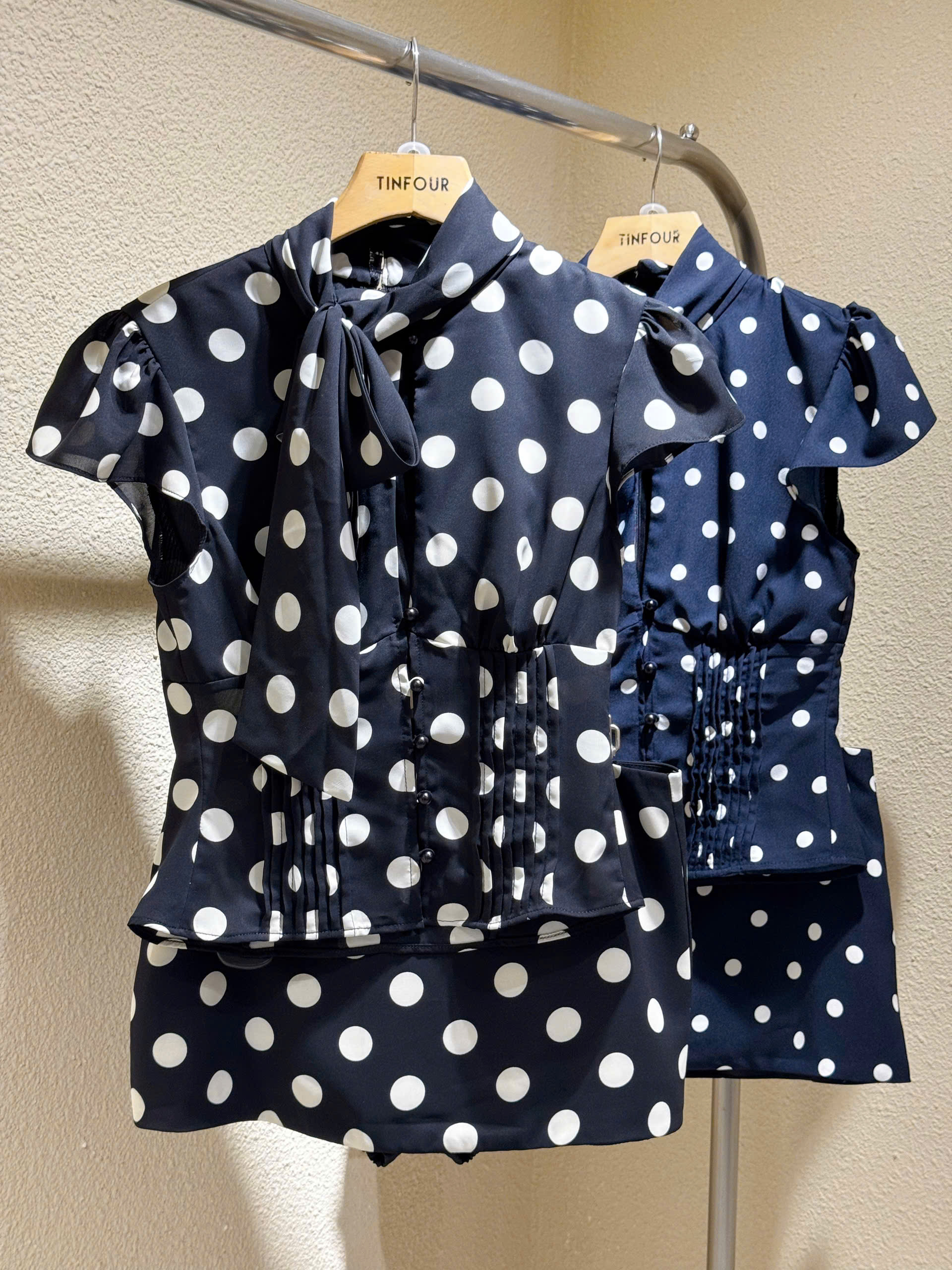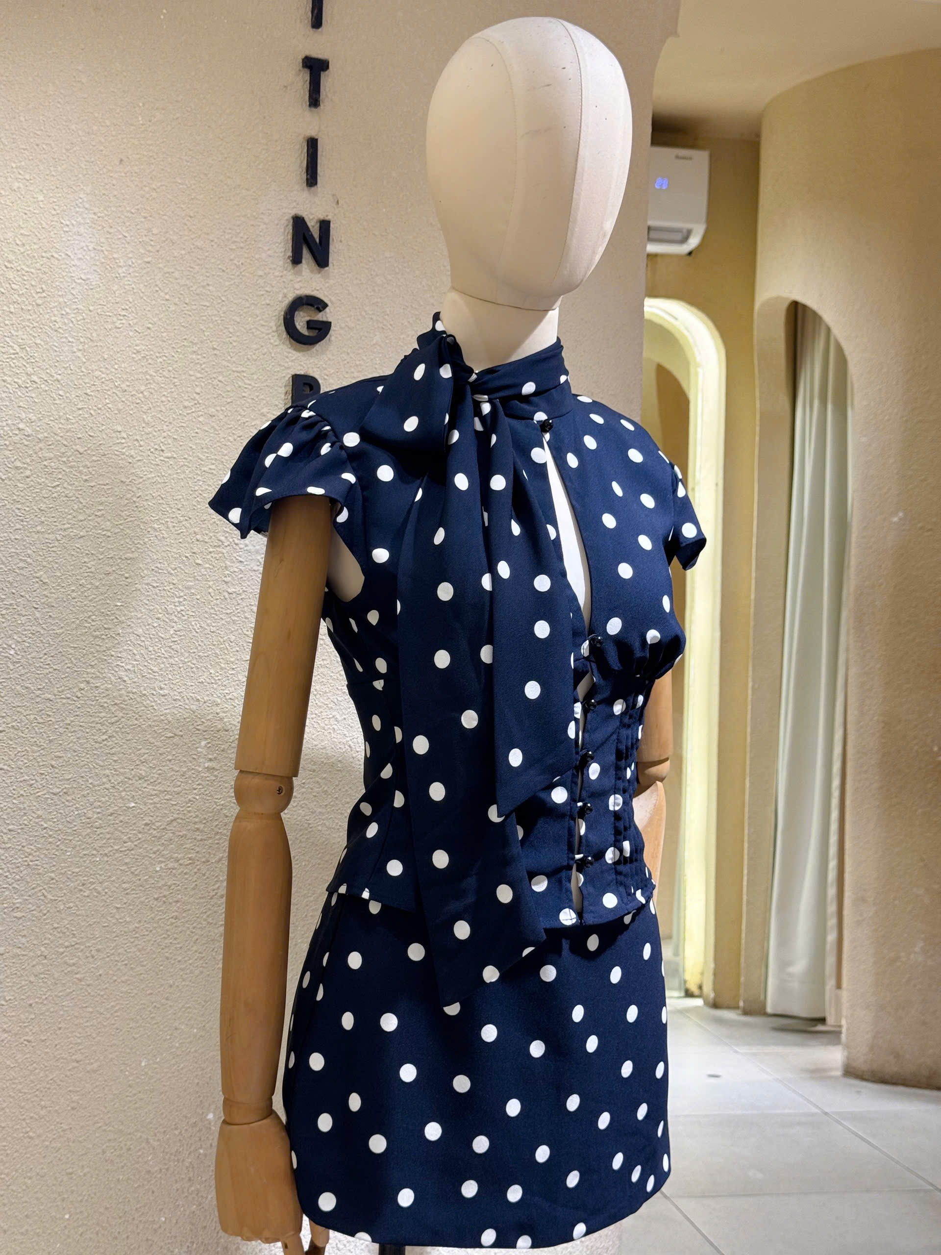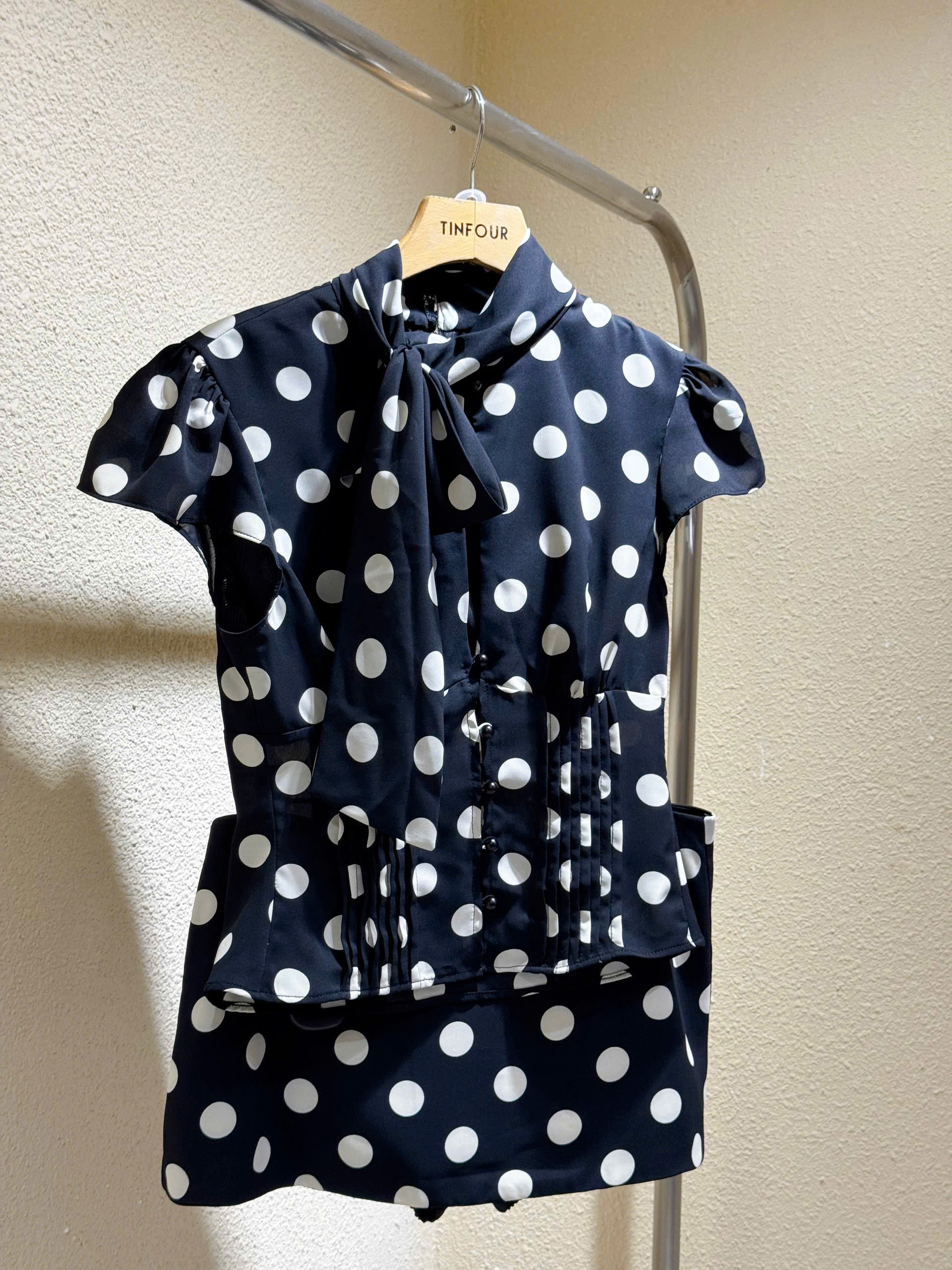 Chấm bi chưa bao giờ lỗi thời và mùa này, họa tiết “điểm xuyết” retro đang làm mưa làm gió. Set áo cổ nơ phối corset cùng chân váy mini mang lại vibe vừa ngọt ngào vừa cá tính. Điểm cộng lớn là dễ phối phụ kiện – từ sandal đến giày cao gót đều hợp.